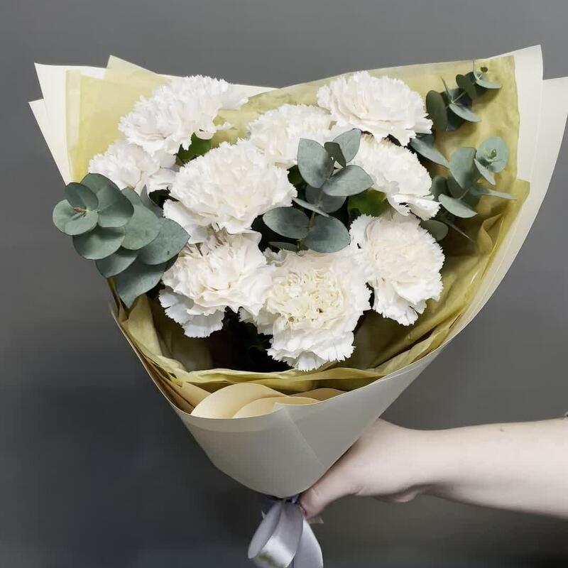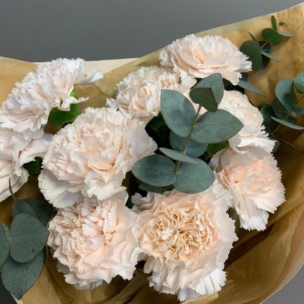 Эвкалипт – 3 шт.Лента атласная – 1 шт.Тишью – 2 шт.Пленка матовая – 3 шт.диантус брют кремовый – 9 шт.