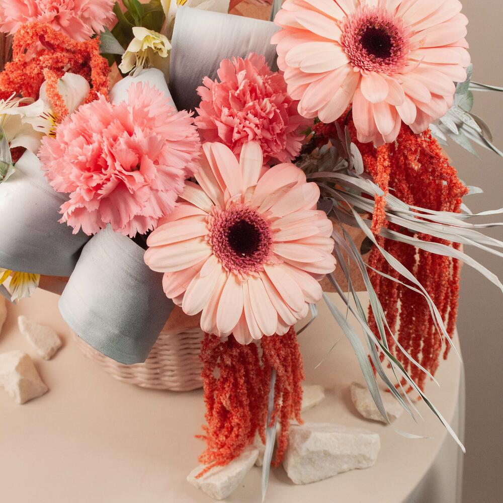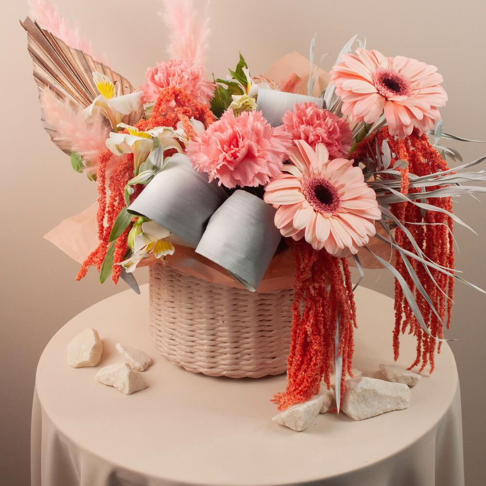 Корзина – 1 шт. Альстромерия – 2 шт. Амарант – 1 шт. Аспидистра – 2 шт. Гвоздика одноголовая – 3 шт. Гербера – 2 шт. Оазис – 1 шт. пальмовое копье – 1 шт. пампас мини – 2 шт. Фисташка – 1 шт.