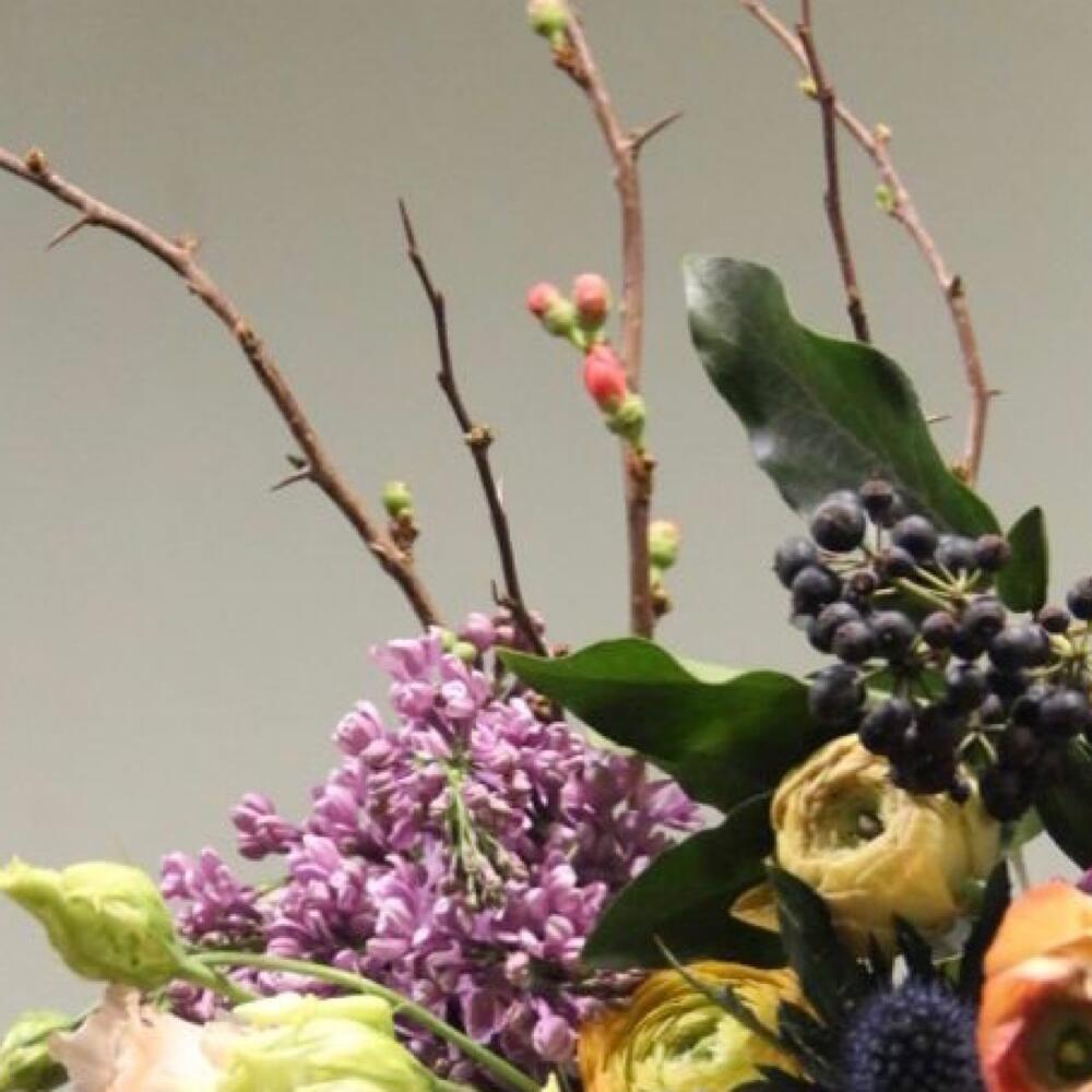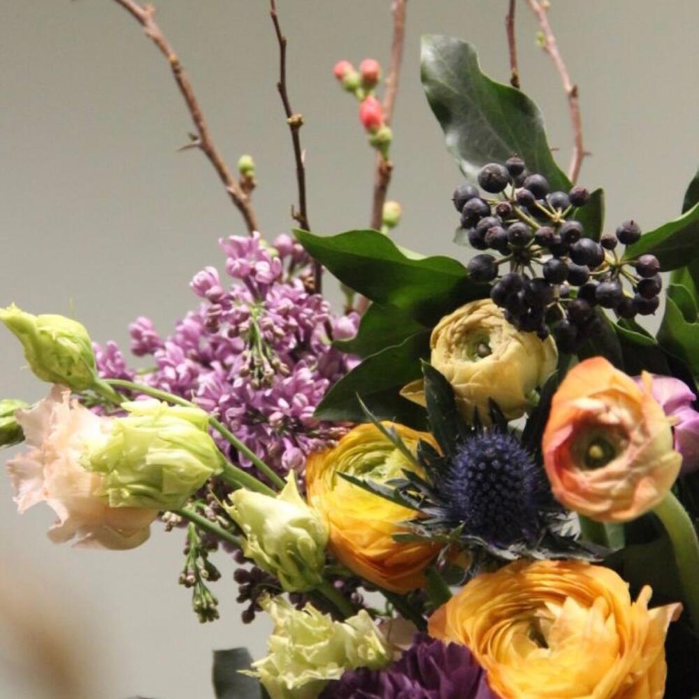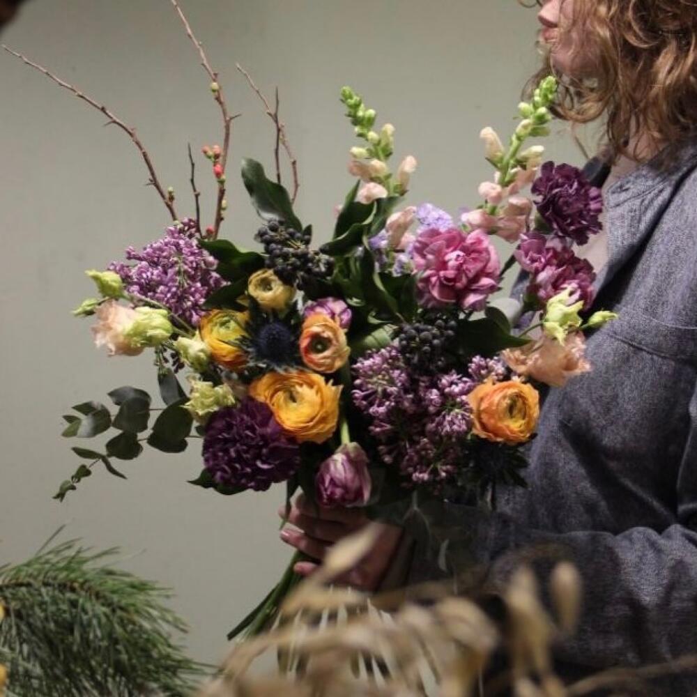 Ранункулюс – 5 шт.Тюльпан – 3 шт.Сирень – 2 шт.Гвоздика – 5 шт.Плющ – 2 шт.айва ветка – 1 шт.колючки ветка – 1 шт.Эвкалипт – 5 шт.Лизиантус – 2 шт.Лента – 1 шт.