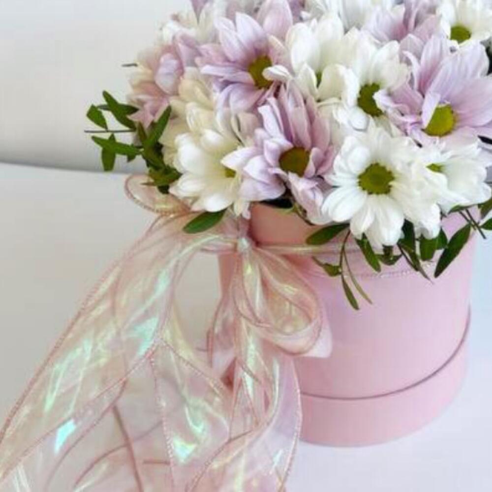 Нежная очаровательная композиция из хризантем в шляпной коробке – отличный комплимент для близкого человека. Свежие ароматные цветы станут приятным сюрпризом и подарят прекрасное настроение.Уважаемые покупатели! Пожалуйста обратите ваше внимание на размер композиции при заказе! Он учитывается вместе с упаковкой Чтобы наши прекрасные композиции дольше радовали получателя рекомендуем вам:⭐Не вынимать цветы из коробки/корзинки⭐Поливать композицию каждый день (воду нужно вливать в центр, чтобы вода правильно распределилась) ⭐Не ставить цветы у отопительных приборов и на сквозняке