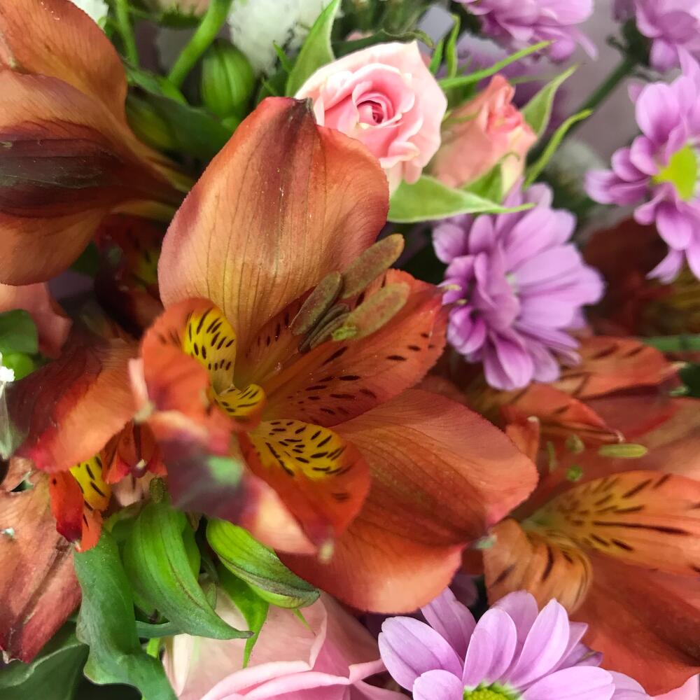 Роза кустовая – 3 шт.Альстромерия – 3 шт.Сантини – 3 шт.Статица – 1 шт.Упаковка дизайнерская – 2 шт.