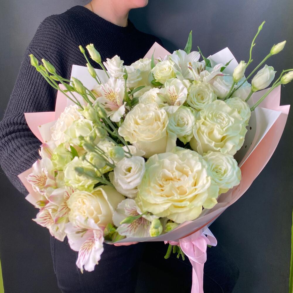 Нежный , трогательный и очаровательный букет из белоснежных цветов. Оформлен в красивую бело-розовую бумагу.Букет нежных цветов – это идеальный подарок , если хочется удивить или сделать приятный сюрприз.День мамы – это великолепный повод порадовать свою любимую мамочку, свекровь или дорогую супругу, которая тоже мама. Выбирая цветы отталкивайтесь от характера матери. Если она нежная , кроткая , воздушная , с тихим и спокойным нравом подарите букет белых , светлых , пастельных тонов. Красиво смотрится нежный градиент или микс из приглушенно-розовых, белых и кремовых оттенков.