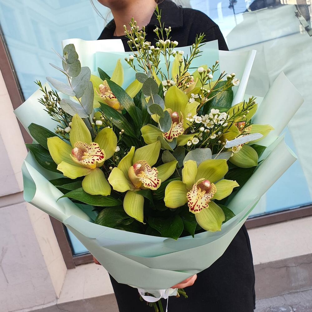Орхидея Цимбидиум – 7 шт.Эвкалипт – 1 шт.Зелень – 10 шт.Ваксфлауэр – 1 шт.Упаковка дизайнерская – 1 шт.Лента атласная – 1 шт.