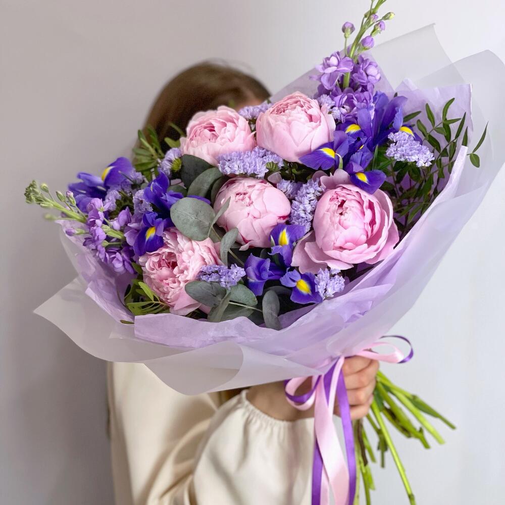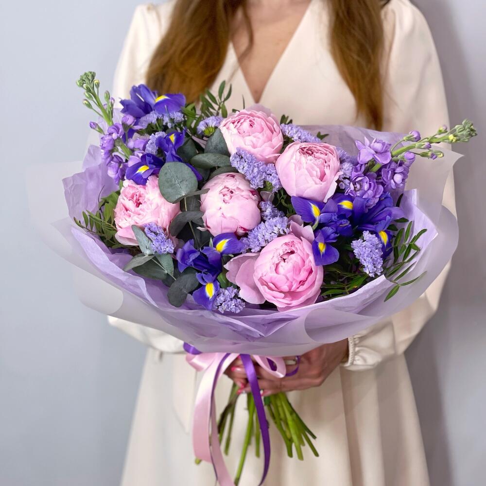 Ирис – 5 шт.Маттиола – 2 шт.Статица – 1 шт.Эвкалипт – 2 шт.Фисташка – 2 шт.Упаковка дизайнерская – 1 шт.пионы сара бернар – 5 шт.