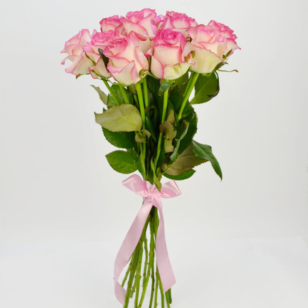 Круглый букет из 15 бело-розовых роз перевязанных атласной лентой. Нежный букет, которому будет рада как молодая девушка, так и женщина в любом возрасте 🙂