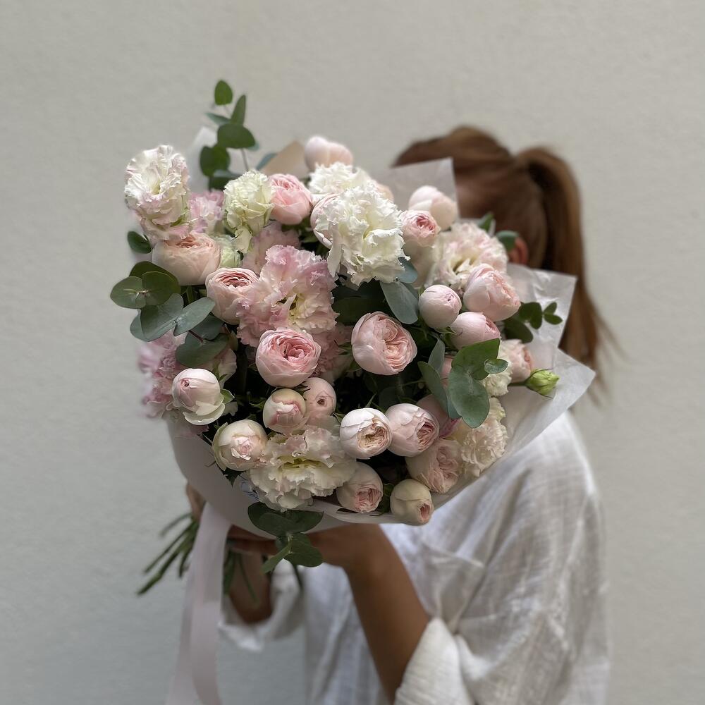 Лизиантус – 3 шт. Эвкалипт – 2 шт. пионовидные спрей роза – 9 шт.