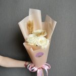 Роза – 3 шт. Лагурус – 5 шт. Упаковка – 1 шт. Атласная лента – 1 шт.