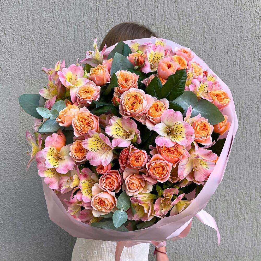 Категории: Альстромерии, Кустовые розы, Розы, Эвкалипт