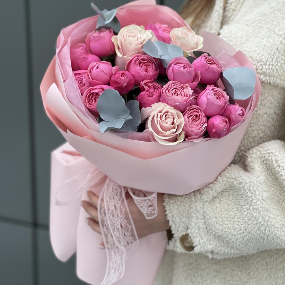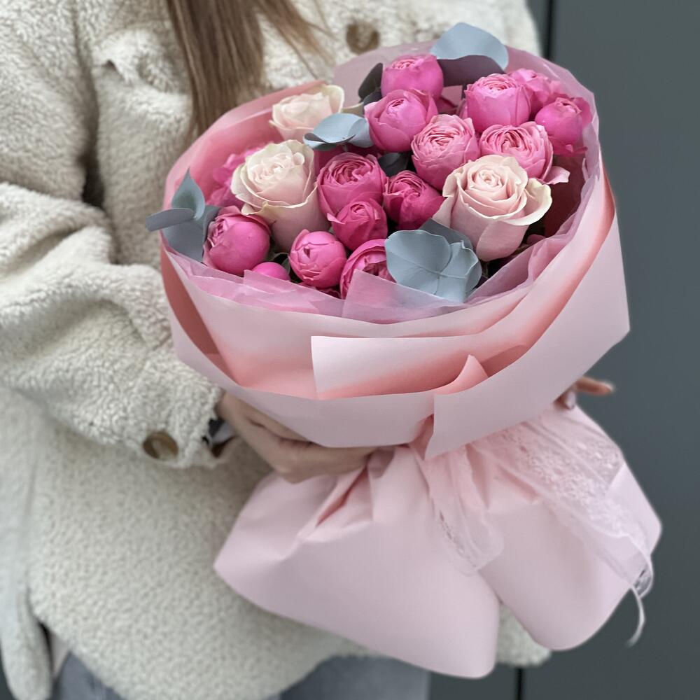 Кустовая пионовидная роза – 6 шт. роза одноголовая pink mondial – 3 шт. Эвкалипт – 2 шт. Оформление – 1 шт.