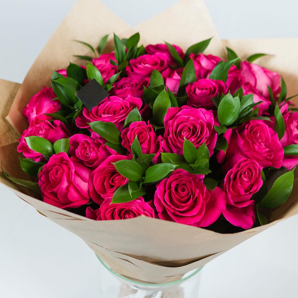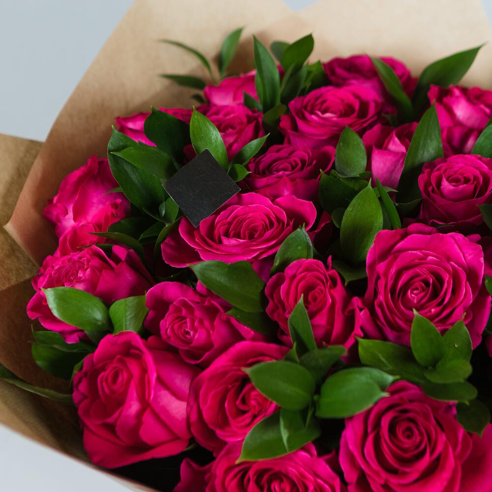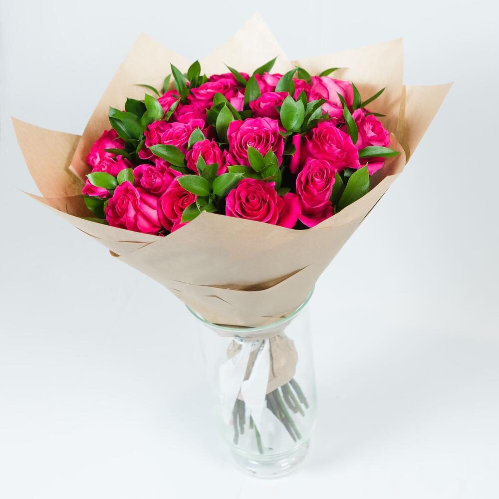 Роза эквадор Pink Floyd – 25 шт.Рускус – 8 шт.Крафт упаковка – 1 шт.Лента атласная – 1 шт.