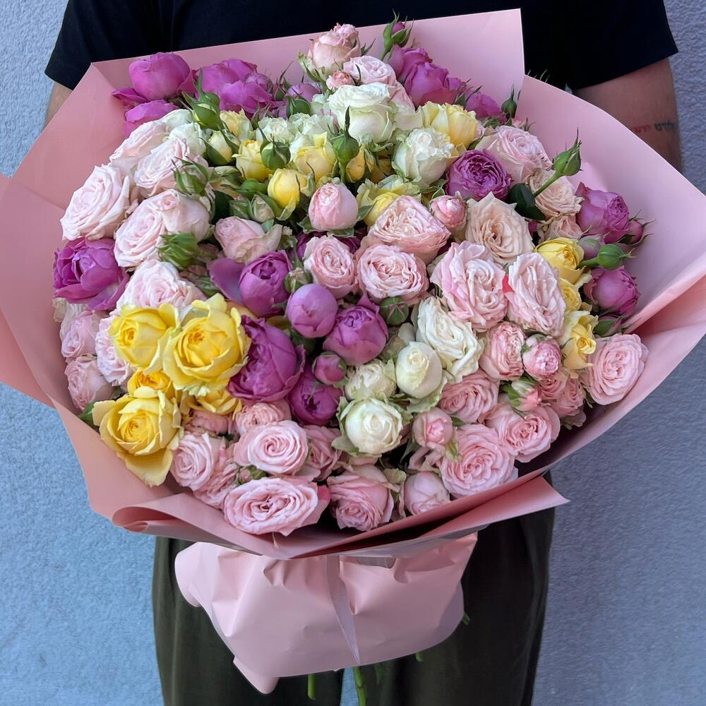 Спрей роза – 61 шт. Подсолнух – 3 шт. Упаковка дизайнерская – 3 шт. Атласная лента – 1 шт. Открыточка с вашими пожеланиями – 1 шт.