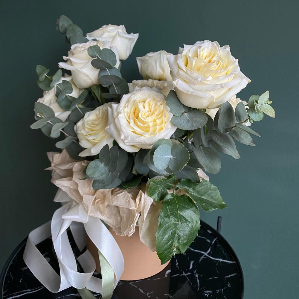 пион роза одноголовая – 9 шт.Эвкалипт – 5 шт.Оазис флористический – 1 шт.Коробка крафтовая – 1 шт.бант атласный – 1 шт.транспортировочная упаковка – 1 шт.