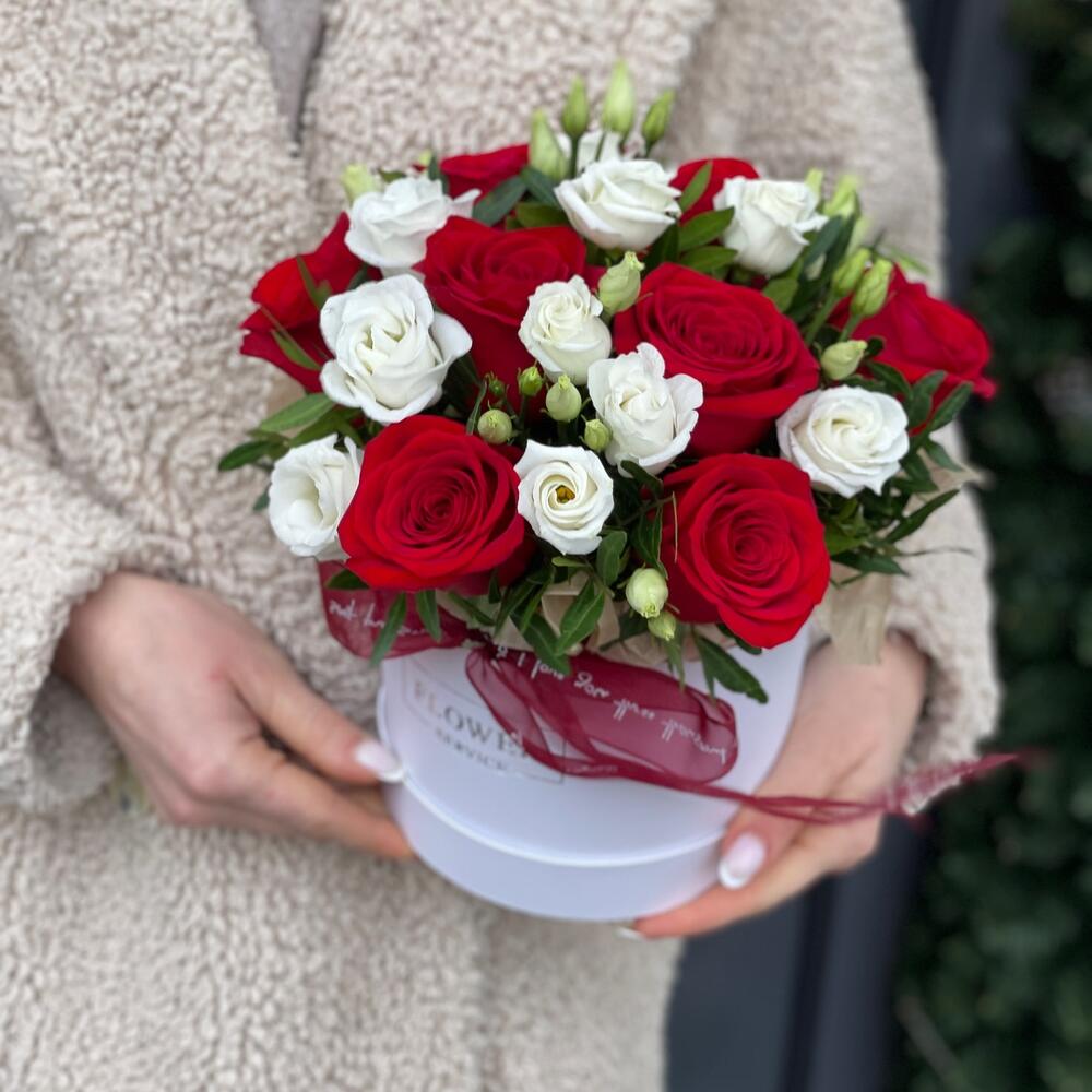 Классическая коробка с красными розами и эустомой!
