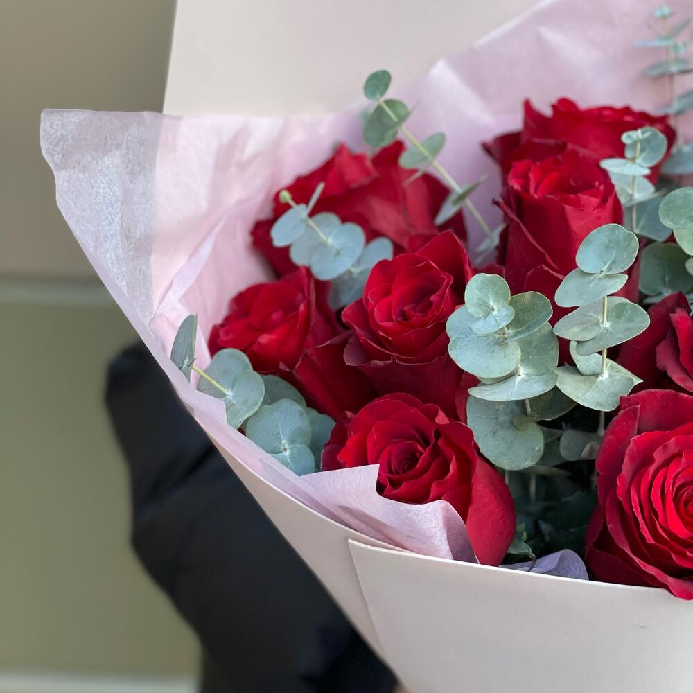 Красные розы с эвкалиптом