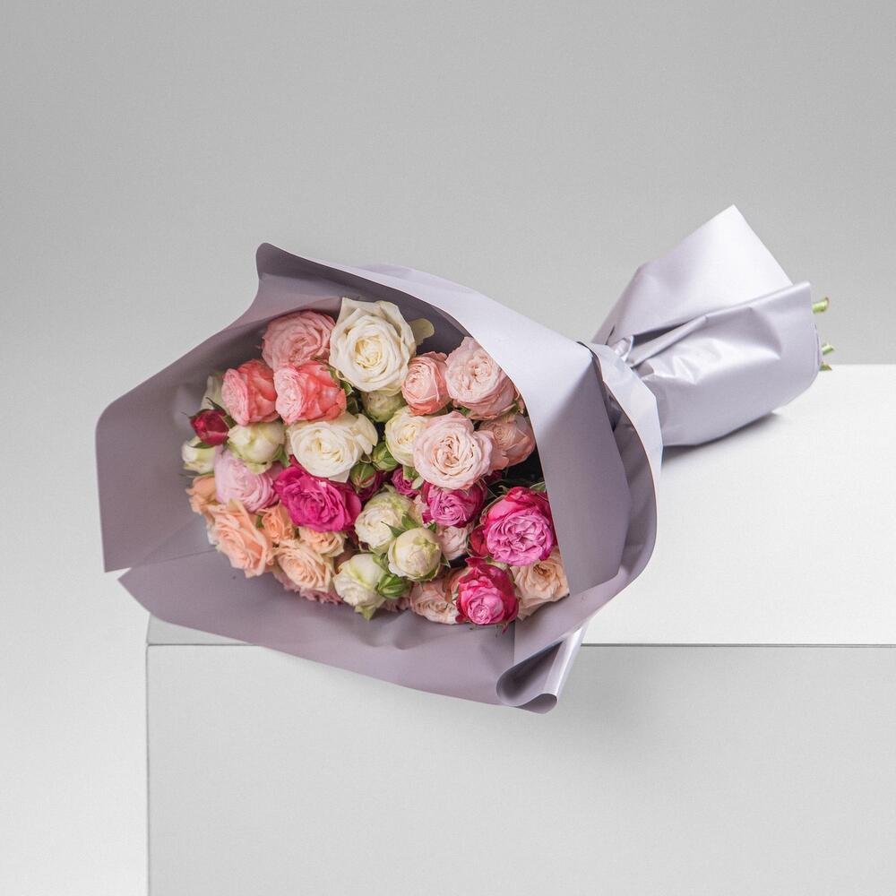 кустовые пионовидные розы – 31 шт. Дизайнерская упаковка – 3 шт. Открытка – 1 шт.