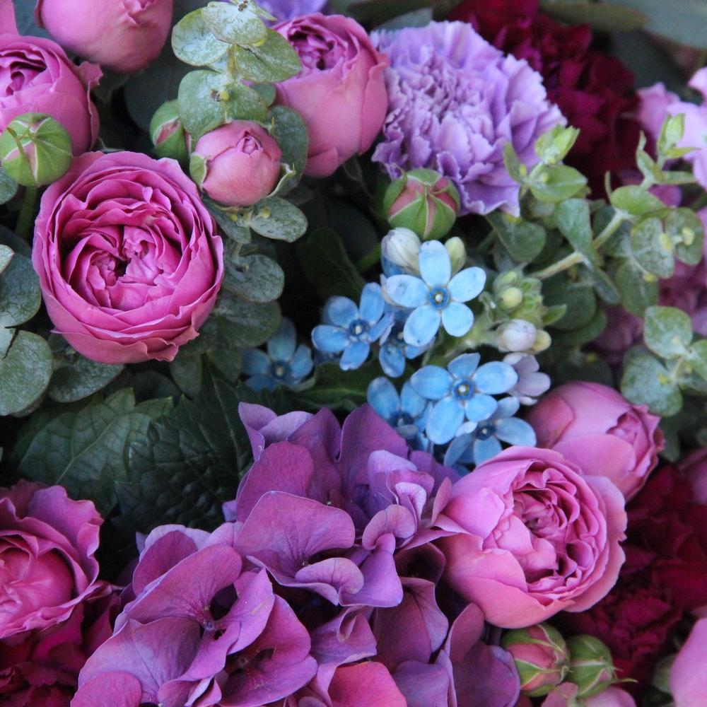 Твидия – 3 шт.Роза пионовидная кустовая – 5 шт.Маттиола – 8 шт.Диантус – 7 шт.Эвкалипт – 9 шт.Тишью – 3 шт.Гортензия – 1 шт.Упаковка – 1 шт.
