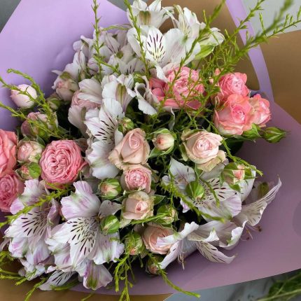 Альстромерии, Гвоздики, Кустовые розы, Лизиантусы, Розы, Хризантемы