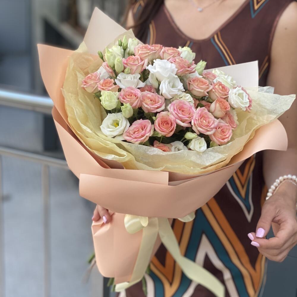кустовая роза азора – 5 шт. эустома белая – 4 шт. Оформление – 1 шт. Писташ – 2 шт.